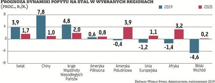 Jak prognozuje World Steel Association (WorldSteel), w całym 2019 r. zapotrzebowanie na stal na świecie mogło wzrosnąć o 3,9 proc., do niemal 1,78 mld ton, w porównaniu z rokiem poprzednim. To mniejszy skok niż w 2018 r., kiedy popyt poprawił się o 4,6 proc. Najsłabiej spośród regionów świata, według prognoz WorldSteel, wypadła Europa. W samej Unii Europejskiej w 2019 r. popyt zmniejszył się o 1,2 proc., do 166,8 mln ton. W pozostałych europejskich krajach zapotrzebowanie na wyroby stalowe tąpnęło aż o 12,1 proc. Rynek napędzały natomiast Chiny, które odpowiadają za połowę globalnej produkcji stali. Wbrew wcześniejszym obawom popyt wzrósł tam o 7,8 proc. względem roku 2018, sięgając 900 mln ton. Napędzany był on głównie przez inwestycje w sektorze nieruchomości, których wartość w pierwszych siedmiu miesiącach 2019 r. była najwyższa od pięciu lat. Jednak w tym roku eksperci przewidują gwałtowne spowolnienie w chińskim przemyśle stalowym. Prognozy wskazują, że zapotrzebowanie na stal w 2020 r. wzrośnie tam zaledwie o 1 proc. Wpłynie na to spowolnienie gospodarcze i dalsze międzynarodowe napięcia handlowe. W ujęciu globalnym WordlSteel prognozuje, że popyt poprawi się w 2020 r. o 1,7 proc. i przekroczy 1,8 mld ton.