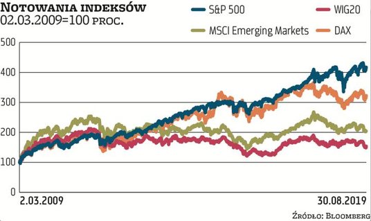 W USA hossa trwa od ponad dekady, co widać po historycznych szczytach nowojorskiej giełdy i osiągniętych stopach zwrotu. Od dołka pokryzysowej bessy z początku marca 2009 r. S&P 500 zyskał do dziś aż 317 proc. w porównaniu z zaledwie 54 proc. wypracowanymi przez WIG20. Lepiej od polskich blue-chips wypadł także koszyk rynków wschodzących, do których wciąż się zaliczamy pod względem klasyfikacji MSCI decydującej o głównych napływach kapitalu: indeks MSCI Emerging Markets pobił nasz wskaźnik wyraźnie, bo zyskał 104 proc. To jednak wynik wyraźnie niższy niż indeksów amerykańskich czy niemieckiego DAX, który zyskał ponad 220 proc. Relatywna słabość rynków wschodzących w porównaniu z rozwiniętymi wynikała w dużym stopniu ze słabości cen surowców (sektor ten ma dużą wagę w wielu indeksach rynków wschodzących) oraz z siły dolara. Polski rynek giełdowy nie jest od notowań surowców mocno uzależniony, ale to nałożyło się na jego strukturalne problemy, czyli branżowy i właścicielski rodzaj spółek tworzących główne indeksy. O ile w WIG20 dominują państwowe molochy z mało perspektywicznych branż, takich jak paliwa, energetyka, finanse, i brakuje prywatnych firm wzrostowych, o tyle w USA w indeksach sporo ważą spółki technologiczne, które stanowiły o sile hossy za oceanem. mr