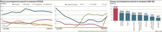 WIG20 od lat zdominowany jest przez spółki finansowe, czyli głównie banki i PZU. Od połowy 2009 r. udział tej branży rósł do rekordowych 53,5 proc. na koniec 2013 r., ostatnio zmalał do 43 proc. ze względu na spory spadek wycen banków z powodu hipotek frankowych (wcześniej zaszkodził im też podatek od aktywów uszczuplający ich zyski o jedną piątą). Przez dekadę wzrósł udział branży paliwowej do obecnych 21 proc. za sprawą wzrostu kapitalizacji Orlenu, Lotosu i PGNiG. Waga górnictwa zmalała z nawet 18 proc. w latach 2011–2012 do 6 proc. obecnie – to głównie efekt spektakularnego spadku wyceny JSW i wypadnięcia Bogdanki z WIG20.