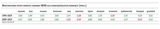 – Jeśli przyjrzymy się historycznym stopom zwrotu indeksu WIG od momentu powstania GPW, to najsłabszymi miesiącami były czerwiec ze średnią stopą zwrotu -1,68 proc. oraz wrzesień z wynikiem -1,30 proc. Z tej więc strony zasada „Sell in May and go away" sprawdza się bardzo dobrze. Skracając jednak próbkę do lat 2009–2019, widzimy przesunięcie właśnie na maj, który staje się najsłabszym miesiącem do inwestowania (-1,52 proc.). Wynikałoby z tego, że inwestorzy zaraz po majówce sprzedają akcje, które odkupują na początku lipca i trzymają je do końca października, który to miesiąc zachowuje się zdecydowanie powyżej średniej – wylicza.