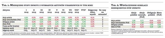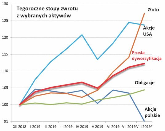 No dobrze, ale na ile to teoretyczne zalecenie: „nie trzymaj wszystkich jaj w jednym koszyku", sprawdza się w praktyce, w szczególności z punktu widzenia polskiego inwestora? O tym, że działa, przekonujemy w naszych zestawieniach rocznych stóp zwrotu z różnych klas aktywów. Ale równie dobrze można się posłużyć bardziej szczegółowymi danymi miesięcznymi. I tak też zróbmy w odniesieniu do tegorocznych danych. Na potrzeby ilustracyjne pod uwagę weźmiemy cztery różne aktywa (akcje polskie, akcje amerykańskie, obligacje skarbowe stałokuponowe, złoto), choć oczywiście wnioski mogłyby dotyczyć o wiele bardziej skomplikowanych portfeli.