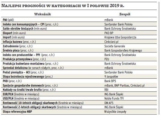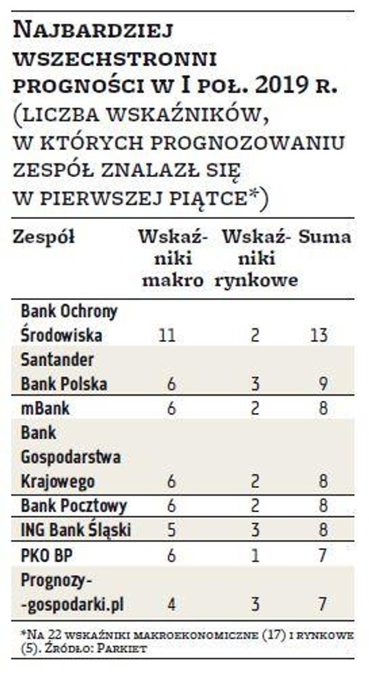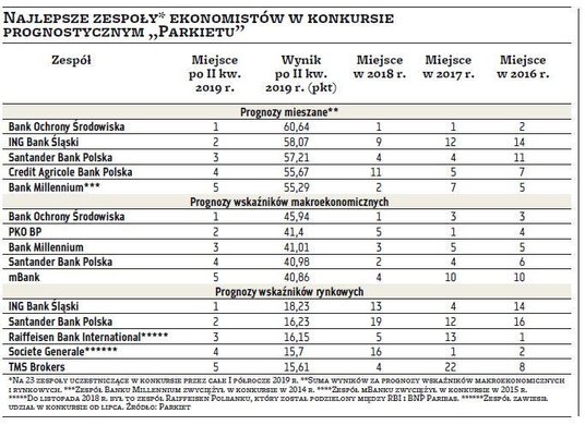 Zespół BOŚ, który tworzą Łukasz Tarnawa i Aleksandra Świątkowska, zwyciężył w konkursie prognostycznym „Parkietu" w latach 2018 i 2017, a w 2016 r. zajął drugie miejsce (za ekonomistami z Banku Gospodarstwa Krajowego). Tak długo dobrej formy w tej rywalizacji, której historia sięga 2005 r., nie utrzymał żaden uczestnik. W I kw. br. ekonomiści z BOŚ dali się wyprzedzić zespołowi z ING Banku Śląskiego (Rafał Benecki, Jakub Rybacki, Piotr Popławski, Karol Pogorzelski), ale szybko odzyskali prowadzenie. Do zmiany doszło także na trzeciej lokacie. W I kw. miejsce to zajmowali ekonomiści z Banku Millennium (Grzegorz Maliszewski, Andrzej Kamiński, Mateusz Sutowicz), triumfatorzy naszego konkursu z 2014 r. i wiceliderzy z 2018 r. Na półmetku z podium strącił ich jednak zespół Santander Bank Polska (Maciej Reluga, Piotr Bielski, Grzegorz Ogonek, Marcin Sulewski, Marcin Luziński), który ubiegłoroczną rywalizację zakończył na czwartej pozycji.