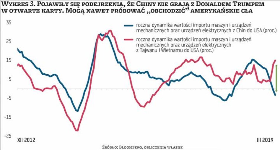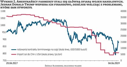 Prawdziwym darem jasnowidzenia wykazali się jednak inwestorzy na rynku soi, czyli drugiego pod względem wartości towaru eksportowanego przez USA do Chin (wykres 2). Ceny tego surowca zaczęły gwałtownie spadać już w drugiej połowie kwietnia, antycypując, jak się okazało – słusznie, gwałtowną zmianę retoryki w kwestii wojen handlowych. Amerykańscy farmerzy są zresztą jedną z najbardziej poszkodowanych grup w dotychczasowych odsłonach konfliktu, jako że eksport soi do Państwa Środka spadł w ciągu roku o ponad 80 proc., a jej cena obniżyła się w tym czasie o 20 proc. (ostatnie odbicie cen pszenicy, soi czy kukurydzy ma związek z niską skalą wiosennych zasiewów, a te z pogodą). Skoro ponad 60 proc. całego eksportu soi z USA trafiało do tej pory na chiński rynek, to jego wypadnięcie musiało spowodować prawdziwy dramat. Doszło nawet do tego, że Donald Trump jeszcze w kwietniu domagał się od chińskich negocjatorów przerzucenia rolniczych ceł odwetowych na jakieś inne produkty, np. samoloty.