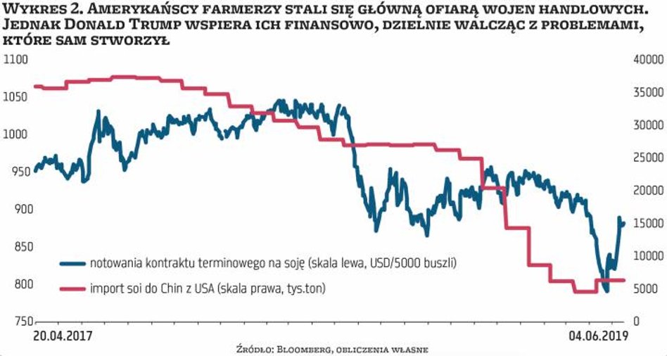 Dlaczego więc amerykańscy rolnicy nie wszczynają głośnego buntu, a ranking aprobaty dla działań amerykańskiego prezydenta podskoczył tuż po ogłoszeniu majowej podwyżki taryf celnych do poziomu najwyższego od zaprzysiężenia na początku 2017 r.? Być może dlatego, że w tym samym czasie administracja Białego Domu zdecydowała o przekazaniu 16 mld USD na rekompensaty dla farmerów, co wraz z sumami przelanymi jeszcze w ubiegłym roku daje ponad 25 mld USD wsparcia (czyli nieco więcej niż łączna wartość opłat celnych, jakie pozyskano dzięki wyższym taryfom w minionych 12 miesiącach).