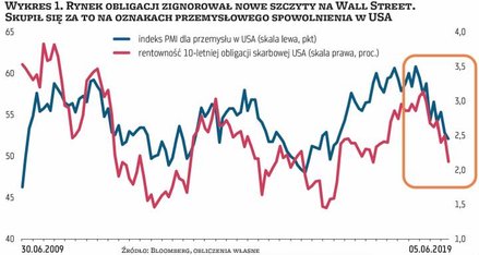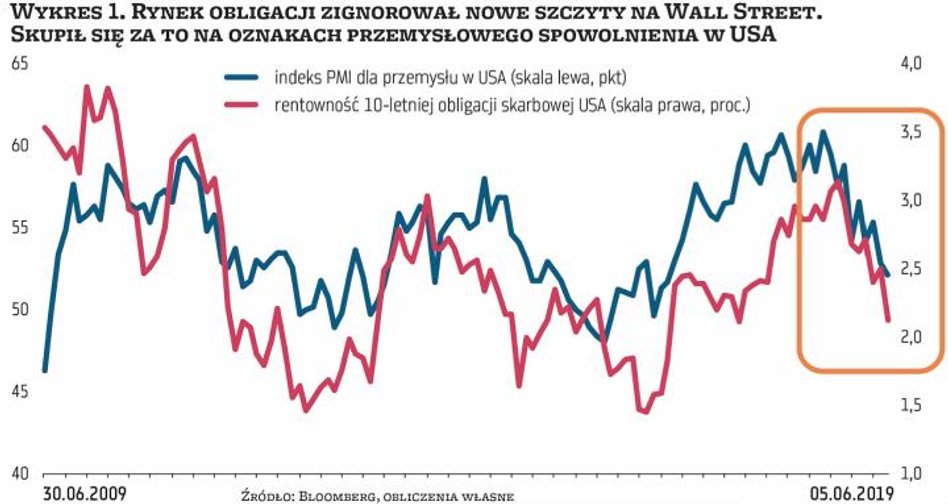 Nowe rekordy na Wall Street przywróciły entuzjazm i wiarę, zarówno wśród inwestorów, jak i konsumentów, których wskaźnik nastrojów powrócił do poziomu z ubiegłorocznego szczytu. Fundusze akcji w USA odnotowały napływy, a oczekiwana przez inwestorów zmienność giełdowych indeksów spadła do dołków z września 2018 r. Było zbyt dobrze. Nie było miejsca na błąd. Z tej perspektywy sytuacja przypominała pierwowzór z początku jesieni w ubiegłym roku. Jednak tym razem rynek obligacji nie zaspał tak jak pół roku wcześniej, gdy nie dał sygnału ostrzegawczego o zbliżającym się przesileniu na rynkach akcji. Tym razem rentowność amerykańskich obligacji skarbowych spadała praktycznie od początku roku, tworząc zastanawiającą dywergencję z pokazem siły giełdowych indeksów na Wall Street. W tym akurat przypadku prognostyczne właściwości rynku obligacji mogły być jedynie odzwierciedleniem faktycznego spowolnienia w gospodarce Stanów Zjednoczonych, widocznego m.in. w spadającym od jesieni wskaźniku PMI dla przemysłu (wykres 1).