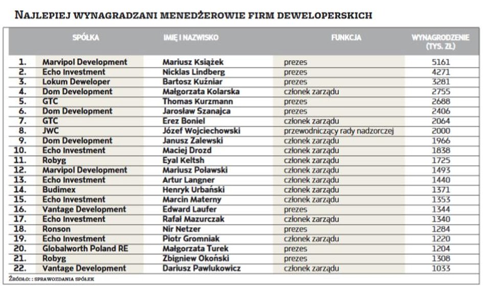 Lider rankingu, Mariusz Książek, prezes Marvipolu Development, otrzymał w 2018 r. 5,16 mln zł wynagrodzenia, co stanowiło równowartość aż 11 proc. zysku osiągniętego przez spółkę w 2018 r. Honorarium Książka urosło o 55 proc., mocniej niż zysk Marvipolu – ten wzrósł o prawie 24 proc., do ponad 47 mln zł. Brak jest informacji, jaka część wynagrodzenia biznesmena to podstawa, a jaka to premia.