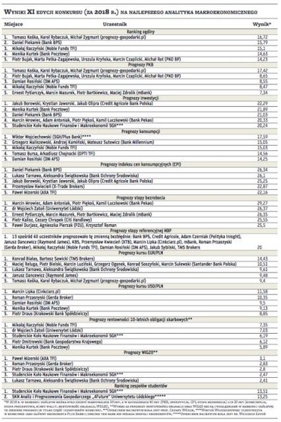 Zdobywców pierwszych pięciu miejsc w każdej z kategorii konkursowych przedstawiamy w tabeli. Warto zwrócić uwagę na to, że w zestawieniu tym często pojawiają się zespoły, które były na podium w poprzednich latach. Na przykład czwarte miejsce w 2018 r. zajęła Monika Kurtek, główna ekonomistka Banku Pocztowego, która na tej samej pozycji była w 2017 r., a rok wcześniej znalazła się na trzecim miejscu. Zespół banku PKO BP, którym kieruje Piotr Bujak, który był wiceliderem rankingu w 2017 r., a rok wcześniej zamykał podium, teraz zakończył rywalizację na piątej pozycji.