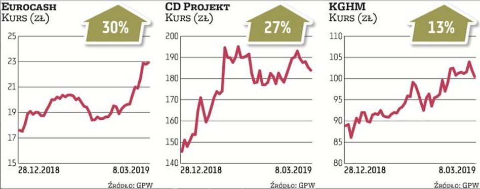 Duże spółki wchodzące w skład WIG20 w 2019 r. radzą sobie ze zmiennym szczęściem. Pozytywnie wyróżnił się Eurocash, którego papiery wróciły do łask inwestorów, dając zarobić prawie 30 proc. Analitycy ostrożnie podchodzą do oceny perspektyw dystrybutora produktów FMCG, mimo solidnych wyników za ostatni kwartał 2018 r. – W Eurocashu kluczowy wpływ na pozytywną reakcję rynku miały dobre wyniki za IV kwartał. Segment hurtowy pokazał bardzo dobre wyniki rok do roku, w tym sprzedaży porównywalnej. Najważniejsze z punktu widzenia inwestorów było jednak ogłoszenie przyspieszenia procesu integracji sieci detalicznej. Poprzednio spółka zakładała, że w tym roku dojdzie do rebrandingu Mili na Delikatesy Centrum i dopiero po jego zakończeniu możliwa będzie integracja m.in. logistyki. Teraz poinformowała, że oba procesy będą się toczyć jednocześnie, dzięki czemu sieć detaliczna będzie gotowa do wzrostu na przełomie 2019 i 2020 r., a nie w 2020–2021 roku, jak zakładałem. To zostało pozytywnie odebrane przez rynek, bo ta sieć detaliczna mocno ciążyła w wynikach. Pozostaje pytanie o efektywność, bo patrząc na historię, w ostatnich latach nie było najlepiej z osiągnięciem założonych celów – zauważa Krzysztof Kawa, analityk Ipopemy.