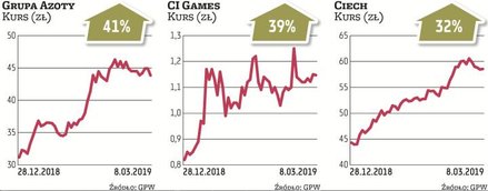 W mWIG40 prym wiodą spółki chemiczne – Grupa Azoty i Ciech. Zmiana nastawienia ma związek z poprawą ich otoczenia. – Spółkom chemicznym od kilku miesięcy sprzyja rynek surowcowy, w szczególności gazu. Jego ceny w Europie w pół roku spadły o ponad 40 proc. z uwagi głównie na ciepłą zimę. Trzeba pamiętać, że Grupa Azoty zużywa rocznie ok. 24 TWh gazu, a Ciech (w Niemczech) ok. 2 TWh, co przekłada się na wyraźną obniżkę kosztów – wskazuje Krystian Brymora, analityk DM BDM. – W Ciechu dodatkowo mamy lepsze otoczenie głównego produktu, sody kalcynowanej. Według informacji branżowych wzrost cen w europejskich kontraktach wyniesie blisko 7 proc. rok do roku w 2019 r., czyli lepiej, niż można było oczekiwać jeszcze pod koniec ubiegłego roku. Grupa Azoty z kolei wprowadza podwyżki cen nawozów, które były niewystarczające w II i III kwartale 2018 r. i przyczyniły się do ok. 150 mln strat w kluczowym segmencie spółki. W ostatnim kwartale ubiegłego roku powinno być już lepiej, a I kwartał, przy niższych kosztach gazu i konsolidacji Compo, zapowiada się wręcz rekordowo – uważa.