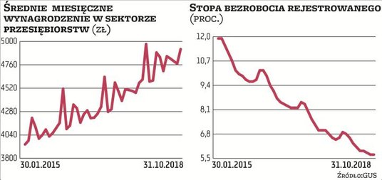 Bank Światowy spodziewa się, że globalny wzrost gospodarczy zwolni w 2019 r. do 2,9 proc. W Polsce tempo ma zmaleć do 4 proc. z 5 proc. w 2018 r. To umiarkowane spowolnienie będzie głównie skutkiem gorszej koniunktury gospodarczej w strefie euro (hamowanie wzrostu ma być kontynuowane również w nadchodzących latach: w 2020 r. polski PKB ma wzrosnąć o 3,6 proc., a w 2021 r. o 3,3 proc.). Ostrożniejsi wobec prognoz na ten rok są ekonomiści Pekao, którzy zakładają, że tempo wzrostu PKB spowolni do 3,5 proc., co będzie skutkiem wyhamowania wzrostu konsumpcji, wynikającego z wolniejszego tempa wzrostu płac i zatrudnienia, a także nieznacznie słabszego wzrostu inwestycji. Polska gospodarka odczuje też słabsze otoczenie zewnętrzne, mniejsze zamówienia eksportowe, słabnącą gospodarkę niemiecką. Zdaniem ekonomistów Nomury „złotowłosa" gospodarka w Polsce (czyli wysoki wzrost gospodarczy i niska inflacja) nie utrzyma się w tym roku, ale dynamika PKB wciąż będzie solidna i wyniesie 3,3 proc. (inflacja CPI ma przyśpieszyć do 2 proc. z 1,7 proc. ze względu na wyższą inflację bazową).