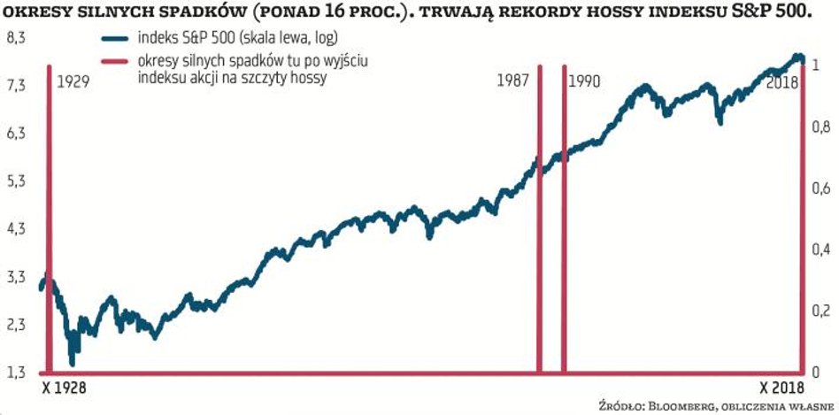 Ubiegłoroczny pokaz słabości w grudniu, teoretycznie najlepszym dla akcji okresie w roku, stał się mocnym argumentem za zakończeniem trendu wzrostowego. W ciągu minionych 80 lat na Wall Street tylko dwukrotnie straty IV kwartału przekraczały te zanotowane w ostatnich trzech miesiącach roku (-14 proc. dla S&P 500). Była to końcówka 2008 r., tuż po upadku Lehman Brothers, a w połowie globalnej recesji oraz ostatnie miesiące 1987 r., podczas słynnego krachu. Równie niecodziennym zjawiskiem były tak silne, jak ostatnio i tak szybkie (trzy miesiące) spadki mające miejsce tuż po osiągnięciu rekordów hossy. Historycznych przykładów tego typu wydarzeń ponownie dostarcza krach z października 1987 r., a także drugi krach z października 1929 roku oraz minibessa z 1990 r. (wykres 1).