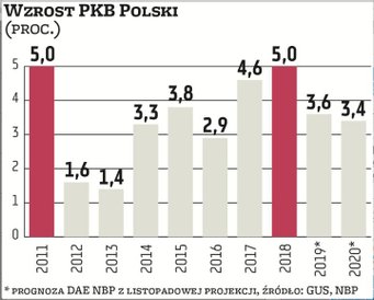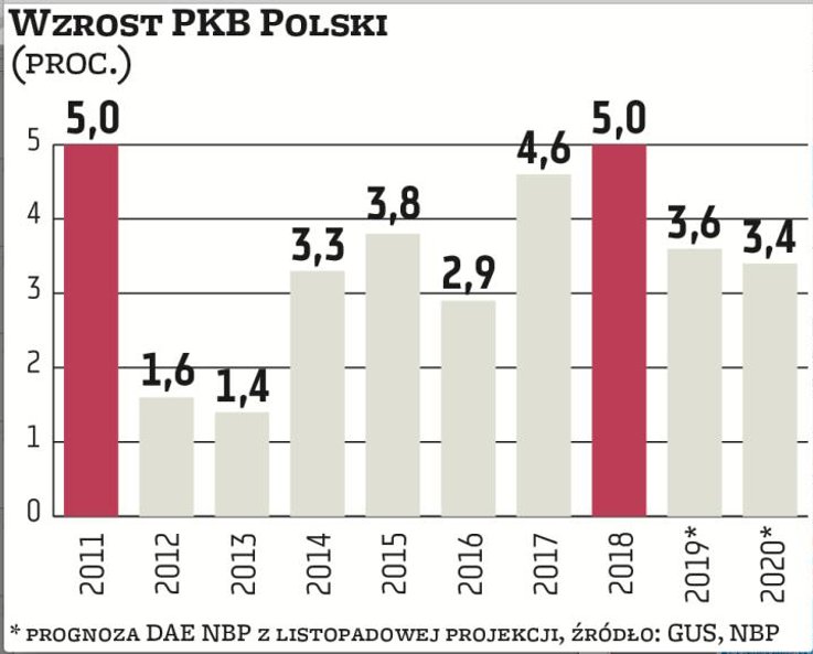 Już od paru miesięcy ekonomiści zapowiadają, że w tym roku polska gospodarka urośnie wolniej niż w ubiegłym, tempo wzrostu PKB może spaść z 5 do około 4 proc. Przedstawiona w listopadzie projekcja inflacji Departamentu Analiz Ekonomicznych NBP zakłada, że wzrost PKB w tym roku wyniesie 3,6 proc., a w przyszłym 3,4 proc. Jednak w ostatnich dniach napłynęło kilka niepokojących danych. Produkcja przemysłowa w Niemczech w listopadzie mocno spadła, co rodzi obawy o techniczną recesję naszego największego partnera handlowego. Także dane z polskiego przemysłu nie napawają optymizmem – grudniowy wskaźnik PMI spadł do 47,6 pkt, z 49,5 pkt w listopadzie. Piąty raz w ciągu sześciu miesięcy znalazł się niżej, niż zapowiadały najbardziej pesymistyczne prognozy ankietowanych przez „Parkiet" ekonomistów (przeciętnie spodziewali się odczytu na poziomie 49,7 pkt). Poza tym ostatnio doszło do pogorszenia nastrojów konsumentów, co obrazują dane GUS i CBOS.