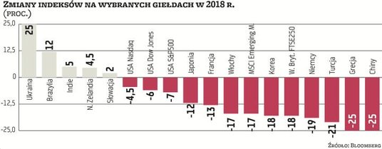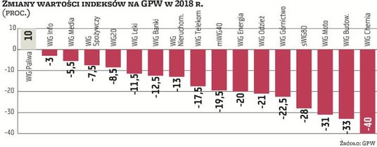 Do najgorzej zachowujących się indeksów branżowych należą w 2018 r. WIG-chemia, zniżkujący o prawie 40 proc., tracący jedną trzecią WIG-budownictwo oraz spadający o ponad 30 proc. WIG-motoryzacja. Po ponad 20 proc. w dół poszły WIG-górnictwo, WIG-energetyka i WIG-odzież. Mimo boomu na rynku mieszkaniowym o 13 proc. zniżkuje WIG-nieruchomości. Relatywnie niewielkie, sięgające 6–7 proc., spadki notują WIG-media i WIG-spożywczy. O 10 proc. w górę idzie WIG-paliwa i jest to jedyny indeks sektorowy kończący rok na plusie, jeśli nie liczyć zwyżkującego o 10 proc. grupującego spółki zagraniczne z naszego regionu WIG-CEE.