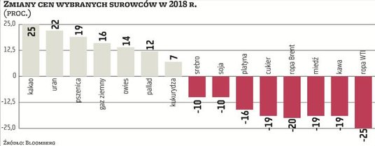 Uwaga nie tylko inwestorów koncentruje się jednak przede wszystkim na surowcach energetycznych, zwłaszcza na ropie naftowej. Notowania WTI idą w dół o 25 proc., a Brent o 20 proc. W ciągu roku tendencje ulegały jednak diametralnym zmianom. Ropa WTI od stycznia do końca września zdrożała o 23 proc., a od października staniała o prawie 45 proc. Bardzo nerwowe były ostatnie tygodnie roku, gdy cena amerykańskiego surowca spadła do 42 dolarów, czyli do poziomu najniższego od połowy 2017 r. Jednocześnie w listopadzie przejściowo silnie w górę szły na NYMEX notowania gazu ziemnego, ale duże wahania na tym rynku o tej porze roku nie należą do rzadkości i z reguły są szybko korygowane, co widoczne było w ostatnich tygodniach. W listopadzie notowania gazu zwyżkowały o 29 proc. w porównaniu z cenami z początku roku, a pod koniec grudnia zwyżka sięgała już tylko 16 proc.