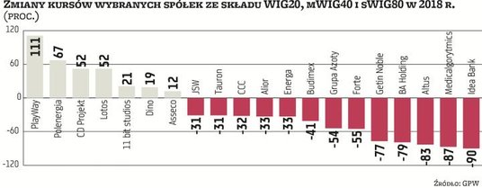 Choć prawdą jest, że spory negatywny wpływ na mWIG40 miały przecenione o ponad 75 proc. akcje Getin Noble, to jednak grono „mocnych" spadkowiczów jest dużo większe. Po 50–55 proc. w dół poszły papiery Forte, Grupy Azoty i Boryszewa. Po około 40 proc. taniały walory Budimeksu, Sanoka i Kruka. Po 30 proc. zniżkowały akcje Stalproduktu, LiveChatu, Intercarsu i Playa. Przed przeceną zdołały się uchronić akcje tylko siedmiu spółek, więc powodów do zadowolenia w tym segmencie z pewnością ma jedynie niewielu inwestorów. Do wyjątków należą posiadacze papierów PlayWay, które zyskują ponad 110 proc. Ale dobra passa w przypadku tej spółki zaczęła się mocno chwiać już na przełomie maja i czerwca, a od końca lipca jej akcje poszły w dół o jedną czwartą. Wciąż na prawie 20-proc. plusie trzymają się walory Dino, ale i w tym przypadku druga połowa roku była już wyraźnie rozczarowująca. Od majowego szczytu zniżkują one o ponad 10 proc., a w najgorszym momencie, w pierwszych dniach listopada, traciły nawet 30 proc. Bardzo podobnie jest w przypadku akcji 11 bit studios, które zwyżkują o ponad 20 proc., ale od majowego szczytu potaniały o ponad 50 proc. Druga połowa roku była za to łaskawa dla posiadaczy papierów Asseco, które zwyżkowały od czerwcowego dołka o prawie 20 proc., a rok kończą zwyżką o 12 proc. Na niewielkim plusie wśród średniaków są jeszcze tylko w skali roku akcje Wirtualnej Polski i Kernela.