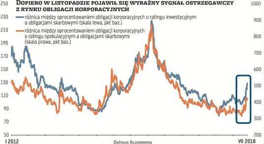 Kolejny sygnał zmiany trendu przyszedł z rynku obligacji korporacyjnych, także tych bardziej ryzykownych (High Yield). Jeszcze w trakcie październikowego tąpnięcia na Wall Street rynek ten zachował się zadziwiająco wstrzemięźliwie. Dopiero listopad przyniósł zmianę sytuacji i gwałtowny wzrost różnicy między oprocentowaniem papierów korporacyjnych, a obligacji rządowych. Dotyczy to również długu o ratingu inwestycyjnym, który stał się jednym z negatywnych bohaterów pierwszego raportu o stabilności finansowej, upublicznionego przez Fed pod koniec ubiegłego miesiąca. Zauważono w nim, że 35 proc. tych „najbezpieczniejszych" obligacji korporacyjnych zostało wyemitowanych przez spółki z najniższego stopnia ratingowej drabinki, które w warunkach spowolnienia gospodarczego mogą z dnia na dzień spaść do segmentu spekulacyjnego, potęgując finansowy chaos na rynkach (a jest tego ponad 2 bln dolarów).