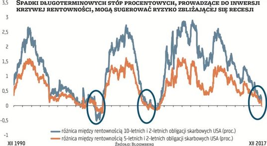 Patrząc na rynek z tej perspektywy, ostatnie tygodnie przyniosły więcej niepokojących sygnałów niż pojawiło się w trakcie październikowej przeceny. Jednym z nich jest spadek rentowności długoterminowych obligacji skarbowych w USA, do którego przyczynił się także prezes Fed Jerome Powell, ogłaszając pod koniec listopada, że podstawowa stopa banku centralnego jest już bliska neutralnemu poziomowi. Przeczyło to jego własnym słowom wypowiedzianym 3 października, gdy padło stwierdzenie o „długiej drodze" do neutralności stóp, co zostało zresztą uznane za przyczynek do rozpoczęcia giełdowej przeceny. W rezultacie praktycznie nastąpiła już inwersja krzywej rentowności w USA, co wielokrotnie było zwiastunem nadciągającej recesji. Dlatego to nie rosnąca rentowność obligacji powinna wzbudzać niepokój wśród inwestorów (jak przyjęło się sądzić), lecz jej spadek, tak jak w pierwszej połowie 2000 roku czy drugiej połowie 2007 roku. W ten negatywny scenariusz wpisuje się zresztą także ostatnia gwałtowna przecena ropy naftowej, której słabość często była zapowiedzią gospodarczego spowolnienia na świecie. Spowolnienia, które jest już zresztą widoczne od pewnego czasu wszędzie, poza USA.