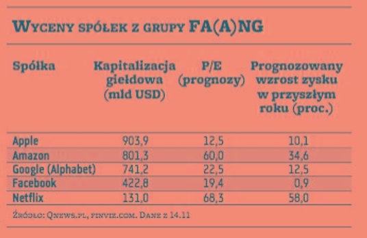 Pocieszające jest, że te dwa przypadki są zdecydowanie najbardziej „rażące", przypominające czasy opłakanej w skutkach bańki internetowej z przełomu wieków – do tej bańki F(A)ANG są zresztą często porównywane. Pozostałe spółki z tej grupy są jednak wyceniane na – co prawda dość wysokich – ale znacznie bardziej rozsądnych poziomach. Jak pokazujemy w tabeli, Facebook czy Google mają wskaźniki Forward P/E rzędu 20. Zaś dorzucany nieco „na siłę" do tej grupy Apple (notabene jeden z faworytów Warrena Buffetta, którego ciężko byłoby posądzać o inwestowanie w drogie spółki) wyceniany jest na ok. 13-krotność przyszłorocznych zysków – to już jest przyzwoity poziom.