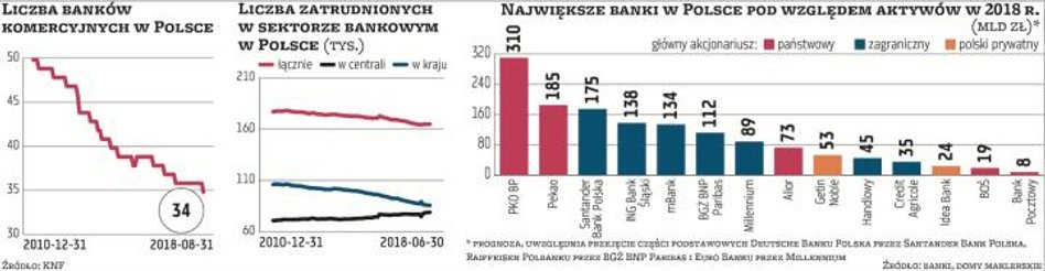 Zapowiedziane właśnie przejęcie Euro Banku przez Millennium za 1,83 mld zł to już kolejna tego typu transakcja w ostatnich miesiącach. W kwietniu okazało się, że BGŻ BNP Paribas za 3,25 mld zł kupi część podstawową Raiffeisen Polbanku, a w grudniu rok temu, że Santander Bank Polska kupi za prawie 1,3 mld zł wydzieloną część detaliczną Deutsche Banku Polska. W latach 2011–2018 było 14 takich transakcji i od końca 2010 r. liczba banków komercyjnych w naszym kraju spadła o 15, do 34 na koniec sierpnia. I to prawdopodobnie jeszcze nie koniec.