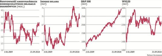 Historyczne rekordy na Wall Street w połączeniu z rosnącą rentownością amerykańskich obligacji skarbowych i słabnącym dolarem to dość nietypowe połączenie. Te zjawiska mają najprawdopodobniej związek ze zbliżającym się posiedzeniem Fed. Podwyżka stóp procentowych jest niemal pewna. To tłumaczyłoby zachowanie dziesięcioletnich papierów skarbowych, których rentowność już w miniony wtorek przekroczyła 3 proc., a w kolejnych dniach zmierzała zdecydowanie w kierunku 3,1 proc., czyli do poziomu najwyższego od maja. Tę niebezpieczną tendencję zupełnie ignorują giełdy oraz dolar. Nie przejmują się nią także rynki wschodzące, korzystające z osłabienia amerykańskiej waluty. Te dywergencje zapewne zostaną skorygowane po posiedzeniu Fedu, które odbędzie się już w najbliższą środę. Od bieżącej decyzji w sprawie wysokości stopy procentowej ważniejsze będą sygnały dotyczące dalszej ścieżki polityki pieniężnej Rezerwy Federalnej i to one mogą ustawić tendencje na rynkach na najbliższe tygodnie.