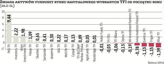 W tym roku jak dotąd czterem towarzystwom udaje się nieprzerwanie z miesiąca na miesiąc zwiększać aktywa pod zarządzaniem (rynku kapitałowego i niepublicznego łącznie) – wynika z danych na koniec sierpnia, prezentowanych przez Izbę Zarządzających Funduszami i Aktywami. Mowa o PKO TFI, Investors TFI, Amundi TFI oraz Baltic Capital TFI. Porównując wynik na koniec poprzedniego roku z aktywami na koniec sierpnia, okazuje się, że PKO TFI urosło o blisko 9,5 mld zł. Złożyły się na to zarówno wysokie napływy, przede wszystkim do PKO Skarbowego (3,3 mld zł), jak również przejęcie Gammy TFI. Z kolei łączne aktywa Investors TFI powiększyły się w tym czasie o prawie 2 mld zł, do około 10,2 mld zł. Od początku roku dobrą passę utrzymywał również Union Investment TFI, jednak w sierpniu jego aktywa stopniały o 1,38 proc. w porównaniu z końcem lipca. Złożyły się na to gorsze wyniki funduszy, jak również wypłaty środków. Według szacunków Trigona DM Union w sierpniu miał 121 mln zł odpływów netto, co uplasowało go na trzecim miejscu od dołu pod względem sprzedaży netto, zaraz przed Trigonem TFI i Altusem TFI. Jeden miesiąc na minusie miała też Ipopema TFI, której łączne aktywa w tym roku zwiększyły się o ponad 9 mld zł, oraz Superfund TFI. Również tylko jeden miesiąc pod kreską był Skarbiec. W jego przypadku chodziło o wypłatę 10 mld zł z funduszu dedykowanego w kwietniu. Ten miesiąc był jak dotąd najgorszy dla całej branży. Łączne aktywa pod zarządzaniem TFI skurczyły się wtedy o 2,65 proc. Zaś najlepszy pod tym względem był marzec (wzrost o 1,75 proc.). Znaczące spadki łącznych aktywów zanotowały w tym roku jeszcze Altus (-2 mld zł), Trigon (-1,42 mld zł) i Quercus (-1,13 mld zł).