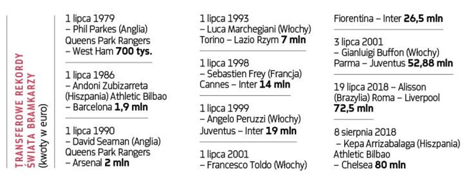To jest dobre lato dla bramkarzy. W ciągu trzech tygodni ustanowili dwa rekordy. Przez chwilę najdroższym człowiekiem w rękawicach był Alisson – Brazylijczyk, za którego Liverpool zapłacił Romie 72,5 mln. W przeciwieństwie do Arrizabalagi jest podstawowym zawodnikiem swojej reprezentacji, a w Serie A mógł się pochwalić najwyższym procentem obronionych strzałów.