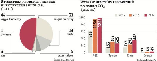 Agencja Moody's pokazała w ostatnim raporcie, jak rosną obciążenia naszej energetyki. I tak koszty zakupu praw do emisji największego wytwórcy, czyli PGE, poszły w górę z 765 mln zł w 2015 r. do ponad 1,2 mld zł w 2017 r. Tauron i Enea płaciły w ub.r. ponad dwukrotnie więcej niż w 2015 r., odpowiednio 325 mln zł i 448 mln zł. Energa wydała 49 mln zł, ale i tam wzrost był zauważalny – sięgnął 48,5 proc. od 2015 r. „Spółki z największą ekspozycją na wytwarzanie konwencjonalne zostaną najmocniej dotknięte przez politykę dekarbonizacji, a redukcja darmowych uprawnień do emisji CO2 będzie wywierać presję na marże w wytwarzaniu", napisała agencja, wskazując na PGE, która ucierpi najmocniej.