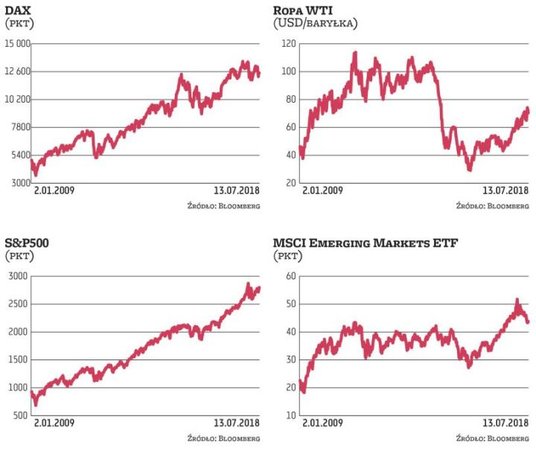 Na pozostałych głównych giełdach światowych aż tak dobrze nie jest, ale amerykański optymizm i tam zdaje się po trosze udzielać. Bilans pierwszych czterech sesji minionego tygodnia wyszedł niemal na zero w przypadku DAX-a, który dość mocno zniżkował jedynie w środę, gdy przerwany został wcześniejszy kilkudniowy rajd. Na razie ta korekta nie przyniosła poważniejszych negatywnych konsekwencji i indeks obronił się przed spadkiem poniżej 12 400 punktów. Europejscy inwestorzy nie mają zbyt wielu powodów do optymizmu. Słabnące perspektywy gospodarcze potwierdziła najnowsza prognoza Komisji Europejskiej, obniżając prognozę wzrostu na obecny rok z 2,3 do 2,1 proc. Szczególne obawy dotyczą sytuacji we Włoszech, a w szerszym wymiarze niepokój budzą głównie zagrożenia związane z napięciami w globalnym handlu. Choć Japonia także jest poważnie zagrożona konsekwencjami protekcjonizmu, Nikkei śmiało idzie w górę, kończąc tydzień wzrostem o prawie 4 proc. i sygnalizując wyczerpanie się potencjału trwającej od połowy czerwca spadkowej korekty. Poprawę widać w ostatnich dniach także na pozostałych parkietach azjatyckich, nie wyłączając Chin. Shanghai Composite w minionym tygodniu zyskał 3 proc., przerywając fatalną serię siedmiu spadkowych tygodni z rzędu. Można mieć pewne wątpliwości, czy wspomniana zwyżka ma charakter naturalny, czy jest to ruch sterowany, ale fakt pozostaje faktem. Indeks znalazł się powyżej 2800 punktów, a zagrożenie kontynuacją przeceny zostało na razie oddalone. Nieco mniej klarowna jest sytuacja wskaźnika rynków wschodzących. MSCI Emerging Markets w trakcie pierwszych czterech sesji minionego tygodnia co prawda wzrósł o prawie 1 proc., ale w tym ruchu widać było sporo nerwowości, szczególnie w środę, gdy tąpnięcie sięgało niemal 2 proc.