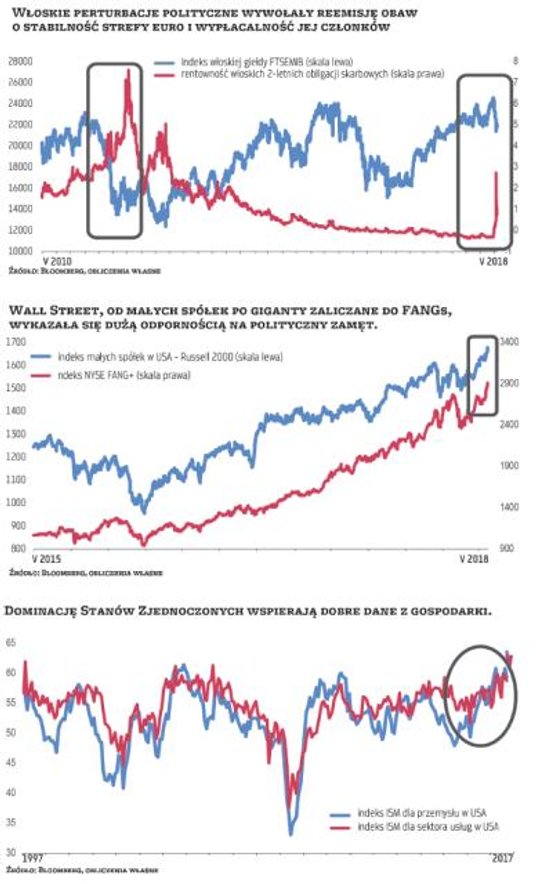 Równie niespodziewane zwroty akcji towarzyszyły trapiącej wielu inwestorów kwestii wojen handlowych. Wizyta amerykańskiej delegacji w Pekinie w pierwszych dniach maja nie przyniosła istotnych rozstrzygnięć. Trudno jednak było oczekiwać cudów, zważywszy, że jednym z głównych negocjatorów był Peter Navarro (doradca prezydenta do spraw handlu), autor trzech książek mówiących o zagrożeniu chińskim ekspansjonizmem gospodarczym i militarnym. Dopiero rewizyta chińskiego wicepremiera w Waszyngtonie, gdzie pierwsze skrzypce grał już sekretarz skarbu Steven Mnuchin (wieloletni pracownik banku Goldman Sachs i „skarbnik" kampanii Trumpa), zaowocowała uzgodnieniem porozumienia, które, zgodnie ze słowami samego Mnuchina, pozwalało ogłosić rozejm w wojnie handlowej. Przedstawiciele Pekinu zgodzili się na stopniowe ograniczanie nadwyżki w wymianie towarowej z USA, przede wszystkim dzięki importowi amerykańskich surowców energetycznych oraz żywności. Trump nie omieszkał pochwalić się tym sukcesem przed farmerami.