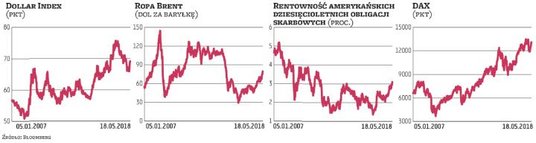 Dopóki trwa polityczne napięcie na Bliskim Wschodzie, Iran w obliczu amerykańskich sankcji, a wenezuelska gospodarka w rozsypce, nie ma co liczyć na spadek notowań ropy naftowej. Ale chwilowa korekta jest jak najbardziej możliwa. W miniony czwartek, po raz pierwszy od listopada 2011 r., za baryłkę surowca typu Brent trzeba było chwilami płacić prawie 80,5 dolara. To prawie dwukrotnie więcej niż rok temu, a więc nie można już udawać, że nic się nie stało i pomijać tego faktu w analizach dotyczących perspektyw gospodarek rozwiniętych oraz inflacji. Wzrost cen surowców, w tym głównie ropy, już jest lub wkrótce będzie widoczny w wynikach spółek oraz dynamice PKB wielu krajów. Przykładem mogą być Niemcy, których gospodarka w pierwszym kwartale spowolniła z 2,3 do 1,6 proc. W kontekście wysokich notowań ropy pewną ciekawostką jest natomiast spadek inflacji w Niemczech i strefie euro i jej wzrost w Stanach Zjednoczonych, które są jednym z głównych producentów ropy. Być może to zjawisko jest jednym z powodów umocnienia się dolara. Inwestorzy widząc spowolnienie w strefie euro i niższą inflację, przestali liczyć na zaostrzenie polityki pieniężnej przez EBC, a jednocześnie spodziewają się kontynuacji cyklu podwyżek stóp przez Fed, a nawet jego przyspieszenia.