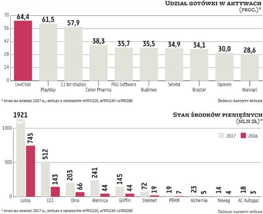 Nie uwzględniając banków, rekordzistą pod względem posiadanej gotówki jest PKN Orlen. Paliwowy gigant na koniec ubiegłego roku miał ponad 6,2 mld zł wolnych środków, o ponad 1 mld zł więcej niż rok wcześniej. W czołówce najbardziej zasobnych w gotówkę firm jest także Lotos, który w porównaniu ze stanem sprzed roku znacząco zwiększył stan posiadania, gromadząc na kontach prawie 2 mld zł wobec nieco ponad 700 mln zł rok wcześniej. – Obie spółki generowały dobre wyniki w latach 2016–2017, znacząco przewyższające wydatki inwestycyjne, w efekcie zmniejszyło się ich zadłużenie netto (dług finansowy pomniejszony o gotówkę). Warto zauważyć, że w I kwartale br. PKN Orlen powrócił do długu netto sprzed kilku kwartałów, ponieważ wydał znaczne środki na zakup Unipetrolu – zauważa Krzysztof Pado, analityk DM BDM.