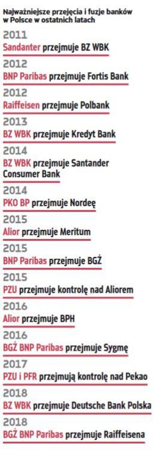 Od lat eksperci wieszczyli konsolidację polskiego, mocno rozdrobnionego wtedy, sektora bankowego. I rzeczywiście, ostatnie lata przyniosły wysyp bankowych transakcji (najważniejsze wymieniliśmy w ramce). Ale polski sektor nadal jest jednym z najmniej skoncentrowanych w regionie, biorąc pod uwagę udział pięciu największych banków w łącznych aktywach (49 proc. wobec 65 proc. w Czechach; na Słowacji i w Chorwacji po 73 proc.), a lider, czyli PKO BP, ma „tylko" 21-proc. udziału w rynku.
