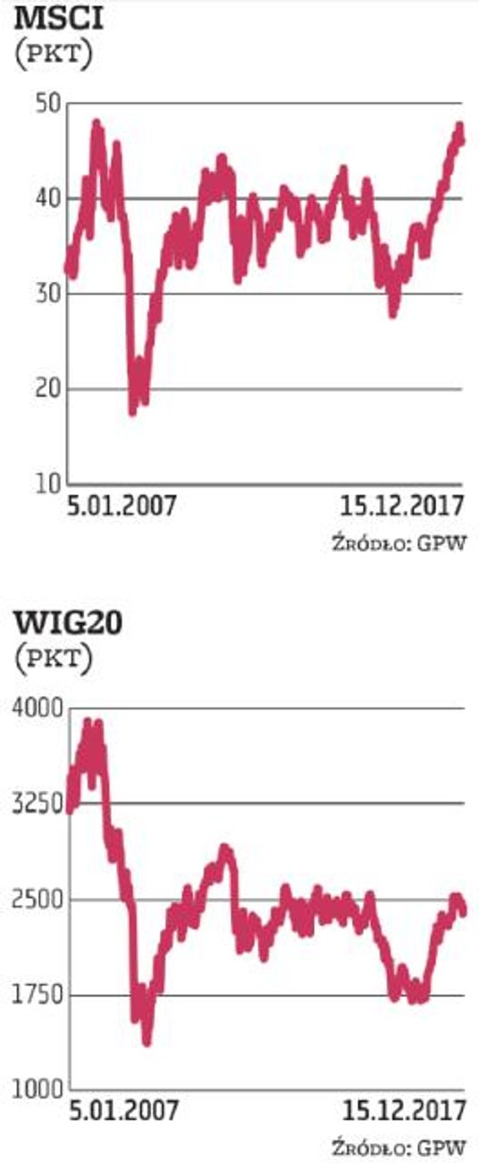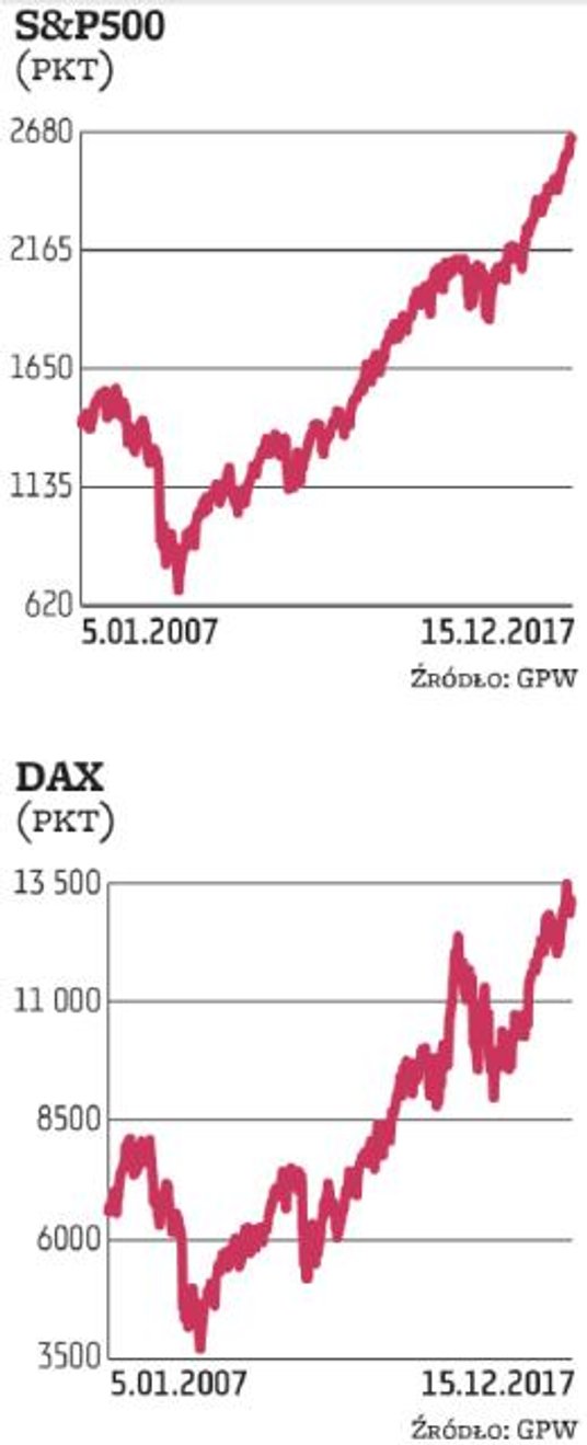 Amerykańska Rezerwa Federalna zgodnie z oczekiwaniami podwyższyła stopy procentowe już po raz piąty w obecnym cyklu i podtrzymała deklarację dokonania trzech ruchów w górę w przyszłym roku. Od stycznia 2018 r. powiększy się także do 20 mld dolarów miesięcznie tempo ograniczania bilansu Fed. Jednocześnie z 2,4 do 2,5 proc. podwyższona została prognoza dynamiki PKB na obecny rok oraz z 2,1 do 2,5 proc. na 2018 r. Amerykańska gospodarka miałaby spowolnić tempo wzrostu do 2,1 proc. dopiero w 2019 r. To scenariusz bardzo optymistyczny i wszystko wskazuje na to, że inwestorzy przyjęli go za dobrą monetę, nie przejmując się perspektywą dalszego zaostrzania polityki pieniężnej. Indeksy na Wall Street kontynuowały bowiem zwyżkę do środy. Dobra passa trwałaby prawdopodobnie nadal, gdyby nie obawy związane z trwającą procedurą uchwalania reformy podatkowej. Informacje o możliwych problemach pojawiły się w czwartek i znalazły odzwierciedlenie w postaci niewielkich, sięgających 0,3–0,4 proc. spadków w przypadku Dow Jonesa i S&P 500 oraz znacznie poważniejszej, przekraczającej 1 proc. zniżce wskaźnika amerykańskich małych spółek. Gdyby okazały się one uzasadnione i Amerykanie nie otrzymaliby obiecanego na święta podatkowego prezentu, prawdopodobieństwo wystąpienia większej korekty zdecydowanie by się zwiększyło.