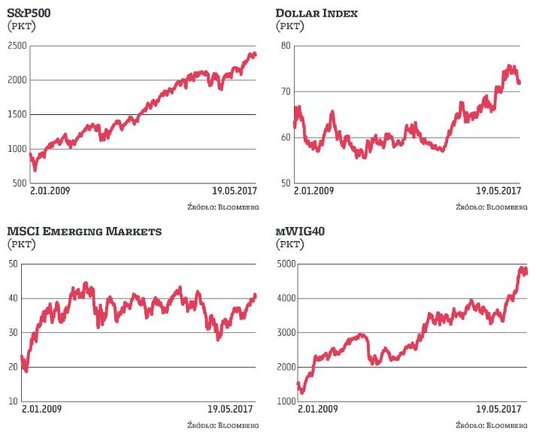 Atmosfera wokół prezydentury Donalda Trumpa, zamiast wchodzić w fazę względnej stabilizacji, coraz bardziej się zagęszcza. Początkowy impet w dążeniu do budowania wielkości Ameryki zatrzymał się na pierwszym poważniejszym zadaniu, jakim była próba zmiany odziedziczonego po Baracku Obamie systemu ubezpieczeń zdrowotnych. Niepowodzenie w tej sprawie poważnie podkopało wiarę w możliwość szybkiej realizacji ambitnych planów przez nową administrację, szczególnie dotyczących reformy systemu podatkowego i programu inwestycji infrastrukturalnych. Po ostatnich wydarzeniach, podważających wiarygodność prezydenta i jego zdolność do w miarę racjonalnego rządzenia największym światowym mocarstwem, podkopana wcześniej wiara doznała kolejnego poważnego uszczerbku. Miarą tego zjawiska jest największe od września 2016 r. jednodniowe tąpnięcie indeksów na Wall Street. W minioną środę Dow Jones i S&P500 straciły po 1,8 proc. W przypadku tego ostatniego oznacza to zdecydowane pogorszenie technicznego obrazu rynku, z czytelnym zarysowaniem formacji podwójnego szczytu. Atak na maksimum z początku marca okazał się nieudany i choć trudno na tej podstawie przesądzać o zakończeniu hossy, to poważniejszą korektę należy jak najbardziej brać pod uwagę. Początkowy impuls może z łatwością ulec wzmocnieniu, bo kolejnych pretekstów na horyzoncie nie brakuje. Warto przypomnieć, że po marcowym szczycie spadkowa fala trwała prawie półtora miesiąca i zabrała amerykańskim indeksom 3–3,5 proc. Biorąc pod uwagę, że maj i czerwiec nie jest najlepszym okresem dla byków, na najbliższą przyszłość trzeba patrzeć z pewnym niepokojem. Będzie on narastał wraz z ewentualnym zbliżaniem się S&P500 w okolice 2330–2340 punktów, wyznaczające dołki poprzedniej korekty. Może to nastąpić stosunkowo szybko, bo dystans jest niewielki, a 65 punktów dzieli indeks od psychologicznej bariery 2300 punktów. Rozwój sytuacji znów niestety zależeć będzie bardziej od polityki niż od fundamentów, a więc trudno tu o jakiekolwiek prognozy.