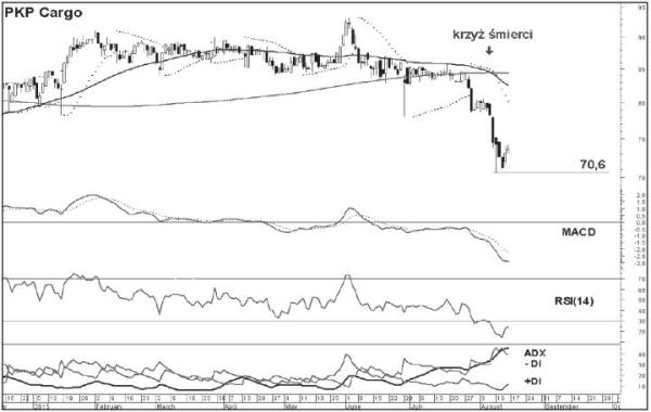 Od końca kwietnia kurs akcji energetycznej spółki porusza się w trendzie spadkowym. W połowie lipca cena przebiła silne wsparcie 21 zł, a następnie przełamała poziom 20 zł, gdzie znajduje się 61,8-proc. zniesienie Fibonacciego dla poprzedniej hossy. W międzyczasie średnia krocząca z 50 sesji spadła poniżej 200-sesyjnej, tworząc formację krzyża śmierci. W ubiegłym tygodniu cena pogłębiła dołek trendu do 18,55 zł, co stanowi potwierdzenie przewagi niedźwiedzi. Ich następne cele to 18,3 zł oraz 17,7 zł. Najbliższy opór to 21 zł.