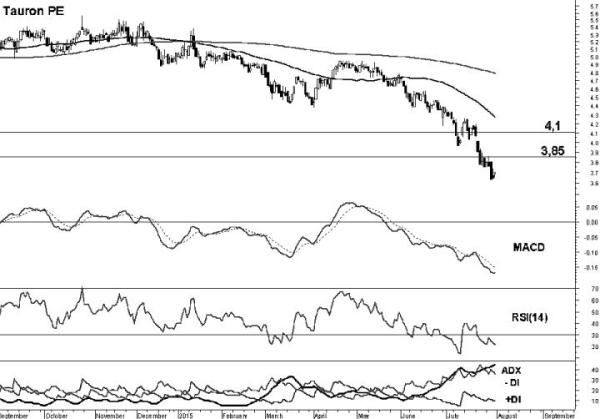 Bessa na akcjach banku rozpoczęła się w lutym 2014 r. Na przełomie czerwca i lipca spadek zatrzymał się na wsparciu 29 zł. Szansa na wykorzystanie tego poziomu do utworzenia formacji podwójnego dna i odwrócenia trendu została jednak zaprzepaszczona. Poziom 29 zł został przełamany długą czarną świecą, a w minionym tygodniu cena spadała w porywach do 28,11 zł. Kurs zbliżył się do długoterminowego wsparcia 27,95 zł, wyznaczonego przez dołek z września 2011 r. Jeśli pułap ten zostanie przełamany, zniżka może sięgnąć nawet 25 zł.