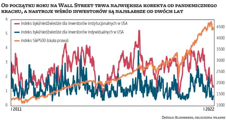 Patrząc na najniższe od marca 2020 r. odczyty różnych wskaźników nastrojów wśród inwestorów czy też wysoki udział gotówki w portfelach funduszy inwestycyjnych towarzyszący najniższej od kilku lat względnej alokacji w amerykańskie akcje (a w spółki technologiczne nawet od 2008 r.), można oczekiwać pewnego odreagowania. Największymi ciężarami, które spychają rynki w dół od początku roku i nie pozwalają im zakończyć korekty, są ryzyko monetarne i ryzyko geopolityczne. To pierwsze dotyczy w gruncie rzeczy utraty zaufania do omnipotencji banków centralnych zarówno w USA, jak i w Europie, gdzie zmiana narracji dotyczącej inflacji zaczyna w niebezpieczny sposób przypominać widowiskową woltę przeprowadzoną w ostatnich sześciu miesiącach przez naszą krajową RPP. Drugie ryzyko jest związane z potencjalną agresją Rosji na Ukrainę i jej konsekwencjami na rynkach surowców oraz finansowym.