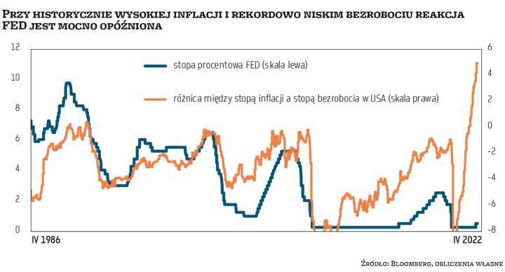 Abstrahując od tego, czy w dzisiejszych warunkach monetarnych stosowanie nachylenia krzywej dochodowości jako narzędzia prognostycznego jest równie uprawnione, trzeba zauważyć, że istnieją dwie zasadnicze przyczyny znaczących rozbieżności w przebiegu różnych wariantów krzywych. Jednym z powodów jest ponadprzeciętna inflacja, która mocno podbiła rynkowe oczekiwania wzrostu cen w najbliższych dwóch latach (dwa razy wyżej niż średnia z dwóch ostatnich dekad), ale nie spowodowała analogicznych zmian w długoterminowej ocenie perspektyw inflacyjnych w USA (dynamika wzrostu cen przez pięć lat liczonych za pięć lat od dziś nie przekracza średniej z lat 2004–2014). Co ciekawe, ostatni raz z podobną różnicą jak dziś mieliśmy do czynienia na początku 2000 roku (wykres 2). Wtedy również nastąpiła inwersja nominalnej, ale nie realnej krzywej dochodowości, co, jak wiemy, 12 miesięcy później nie przeszkodziło w rozpoczęciu prawdziwej recesji w USA. Poza tym, gdy porównamy realne rentowności dziesięcio- i dwuletnich obligacji, ale takich, których rynek oczekuje dopiero za dwa lata (czyli eliminując obecny wystrzał inflacyjnych oczekiwań), okazuje się, że odwrócenie realnej krzywej jednak miało miejsce. Drugim powodem różnic w zachowaniu krzywych dochodowości jest mocno opóźniona reakcja Fedu na zaskakująco wysoką i uciążliwą inflację w obliczu szybko spadającego bezrobocia, przez co porównanie długoterminowych stóp procentowych z bardzo krótkoterminowymi (np. trzymiesięcznymi) pokazuje moim zdaniem obraz rzeczywistości oglądanej we wstecznym lusterku (wykres 3).