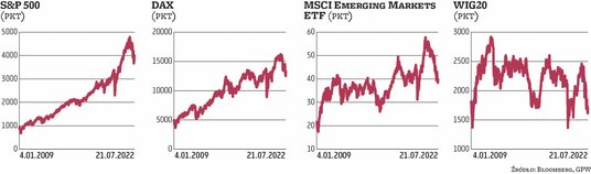 Choć sezon publikacji wyników amerykańskich firm nie zaczął się najlepiej, a przekonanie o groźbie recesji stało się bardziej realne, to jednak obniżenie się oczekiwań wobec stanowczości działań Fedu skłoniło inwestorów do większego optymizmu i aktywności. Najbardziej wpłynęło to na segment spółek nowych technologii. Nasdaq Composite do czwartku wzrósł o 5,3 proc., kontynuując zapoczątkowaną pod koniec czerwca tendencję. S&P 500 zwyżkował o solidne 3,5 proc., a Dow Jones szedł w górę o niemal 2,5 proc. Także na naszym kontynencie miała miejsce poprawa nastrojów. Niemiecki DAX zwyżkował o 3 proc., starając się przerwać złą passę. Indeks w Paryżu rósł o 2,7 proc., a londyński FTSE 250 zwyżkował o prawie 5 proc. Gorzej za to wiodło się Stoxx Europe 600, który zyskiwał do czwartku jedynie 2,4 proc. Z osłabienia amerykańskiej waluty skorzystały rynki wschodzące, ale trudno tu mówić o euforii. MSCI Emerging Markets szedł w górę o nieco ponad 3 proc., co nie stanowi przełomu w fazie poruszania się tego indeksu w bok, na poziomie najniższym od dwóch lat.