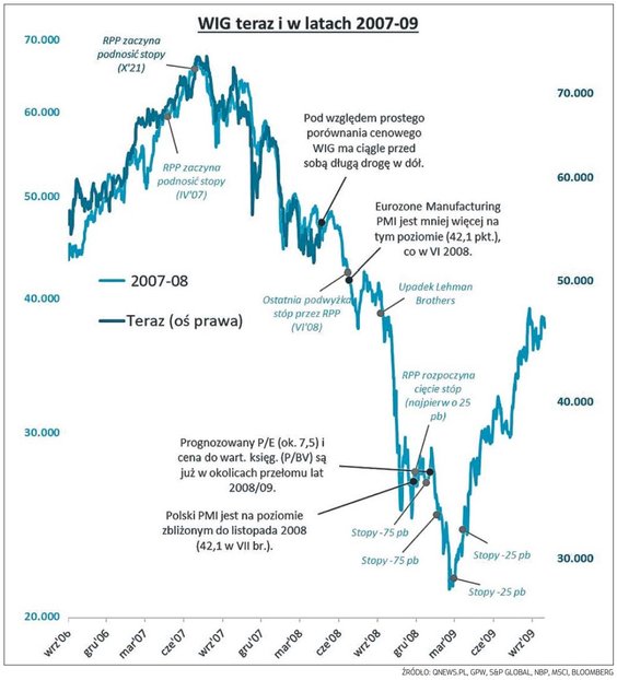 Pamiętajmy też jednak, że nawet tak niskie wyceny nie uchroniły WIG-u przed wykonaniem jeszcze jednego dynamicznego ruchu w ramach ówczesnej bessy, w pierwszych tygodniach 2009 roku. Dotarcie wskaźników wyceny do poziomów zbliżonych do obecnych miało jednak o tyle pozytywne znaczenie w analizowanym historycznym epizodzie, że mimo ostatniej „nogi” rynku niedźwiedzia potem akcje zaczęły dynamicznie drożeć i szybko odrobiły straty z końcowego etapu bessy. Innymi słowy, obecne wyceny są zachętą do akumulacji walorów, ale nie gwarantują jeszcze natychmiastowego zakończenia trendu spadkowego – to jedna z ważniejszych lekcji z omawianego porównania.
