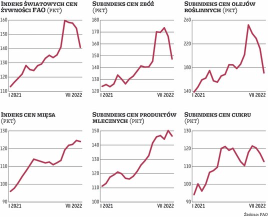 W marcu, zaraz po wybuchu wojny w Ukrainie, indeks cen żywności FAO wystrzelił w górę do 159,7 pkt. Wykonał gigantyczny skok aż o ponad 18 pkt, czyli o blisko 13 proc., w porównaniu z również rekordowym lutym. Znalazł się tym samym na najwyższym poziomie w historii notowań, czyli od 1990 r. Kwiecień, maj i czerwiec dość zaskakująco przyniosły lekkie spadki.