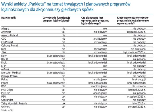 Wśród firm, które już od kilku lat mówią o chęci wprowadzania programu lojalnościowego, a nawet o przygotowywaniu odpowiedniej oferty jest KGHM. Konkretnych efektów jednak brak, co potwierdza jednozdaniowa odpowiedź na wszystkie nasze pytania zadana tej spółce. Być może w przyszłym roku z odpowiednią inicjatywą wyjdzie JSW, ale i ona nie podaje konkretów. W tym kontekście należy też zauważyć, że niektóre spółki w ogóle nie odpowiedziały na nasze pytania (Answear, Kęty, Kruk, Mercator i Pepco), co też może świadczyć o ich podejściu do relacji z rynkiem.