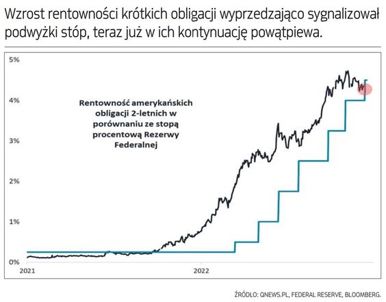 Koniec podwyżek, okrzyknięty na rynku mianem „Fed pivot” (punkt zwrotny w polityce Fedu), staje się coraz bardziej prawdopodobny również przez pryzmat zachowania rynku obligacji. Rentowność dwuletnich papierów skarbowych, która wcześniej z dużym wyprzedzeniem zaczęła sygnalizować spóźniony początek podwyżek stóp, teraz dla odmiany zaczyna sygnalizować ich koniec. Pojawił się właśnie znamienny sygnał – rentowność dwulatek znalazła się poniżej stopy procentowej Fedu.