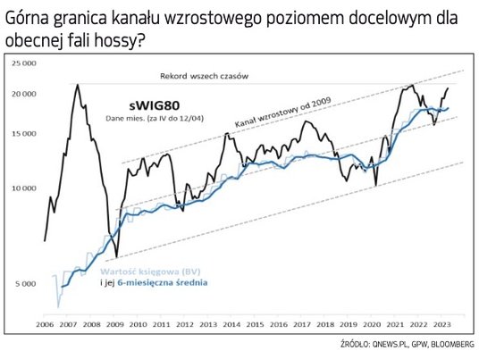Przyglądając się ostatnim sukcesom gromadzącego małe spółki indeksu sWIG80, można wręcz przecierać oczy ze zdumienia. Jeszcze nie tak dawno (wrzesień 2022) pogłębiał on przecież dołki ubiegłorocznej bessy, a tymczasem nieco ponad sześć miesięcy później jest coraz bliżej historycznego rekordu z września 2021 (21 737 pkt w cenach zamknięcia), pokrywającego się przy okazji z położonym nieznacznie niżej szczytem z 2007 roku (z kolei wg danych miesięcznych widocznych na wykresie to szczyt z 2007 jest nieco wyżej).