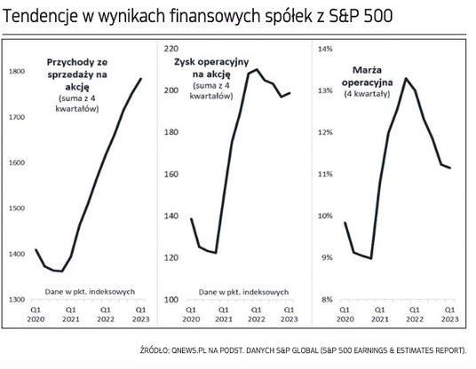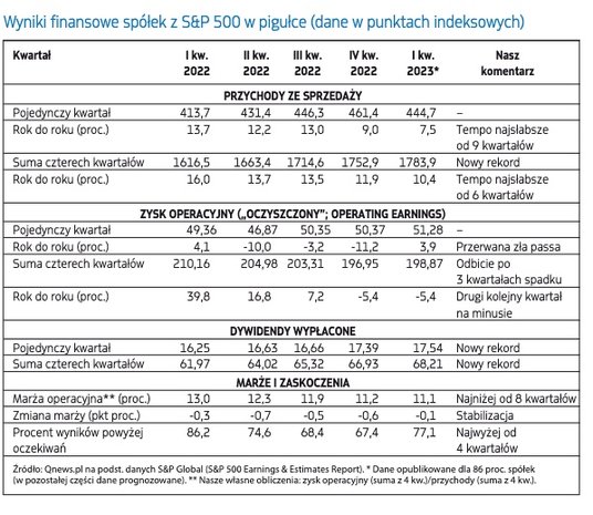 Już na początku sezonu publikacji wyników w komentarzach analityków przewijał się motyw tzw. recesji wynikowej (ang. earnings recession), definiowanej jako drugi z rzędu spadek rok do roku zysku operacyjnego (liczonego jako suma czterech kolejnych kwartałów). Trzeba przyznać, że to tradycyjne kryterium zostało faktycznie spełnione, aczkolwiek tempo tak liczonego spadku zysków było stosunkowo niewielkie – wyniosło -5,4 proc. rok do roku, dokładnie tyle samo, ile w IV kwartale 2022 r.