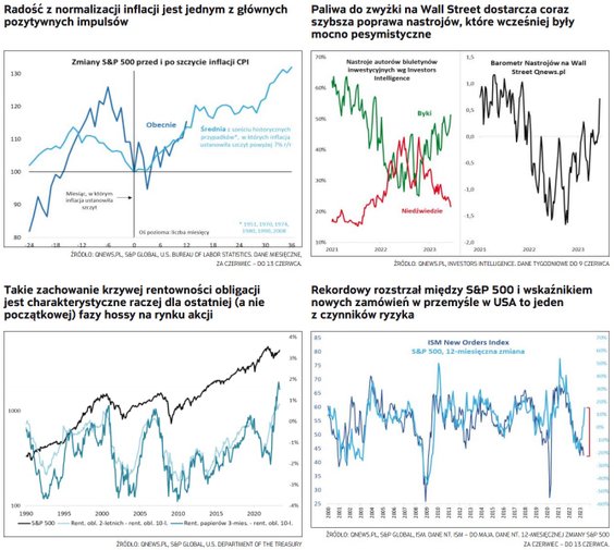 Spróbujmy pochylić się nad istotą i uwarunkowaniami tego byczego zwrotu na Wall Street w kończącym się I półroczu. W najprostszym wydaniu odrodzenie rynku akcji wytłumaczyć można odwróceniem o 180 stopni jednego z najważniejszych czynników, które szkodziły akcjom przez większość ubiegłego roku, czyli... wystrzału inflacji. Podczas gdy dokładnie rok temu inflacja CPI w USA osiągnęła poziom najwyższy od ponad czterech dekad (blisko 9 proc. rok do roku), to obecnie kontynuuje trend spadkowy z tych wysokich pułapów. W maju obniżyła się do 4 proc. (r./r.), a w czerwcu według obecnych szacunków może zejść bliżej 3 proc. Szybka normalizacja inflacji oznacza też w praktyce koniec konieczności dalszych podwyżek stóp procentowych. Oba te elementy (dezinflacja, „Fed pivot”) wymienialiśmy na przełomie roku po stronie najbardziej „byczych” czynników na 2023 r. Podczas gdy nie brakowało też czynników ryzyka (o czym za chwilę), to czołowe miejsce wśród naszych najbardziej optymistycznych wykresów zajmowała ilustracja pokazująca wzrostową, historyczną ścieżkę S&P 500 po odnotowaniu ważnych szczytów inflacji.