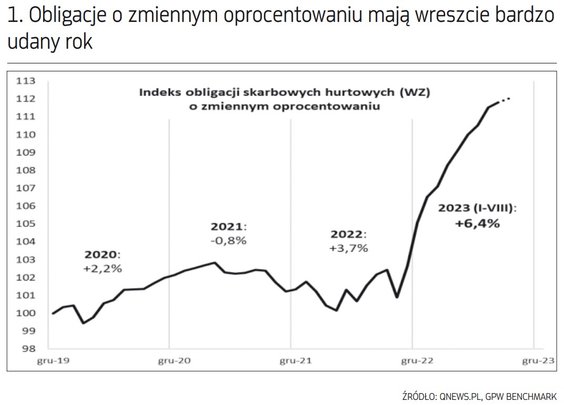 W tym roku inwestorzy zbierają wreszcie owoce – dzięki dużo wyższemu oprocentowaniu obligacje zmiennokuponowe wreszcie w pełni „rozwinęły żagle”. Indeks papierów skarbowych o takiej konstrukcji (obejmujący serie typu „WZ”) od początku roku do sierpnia wzrósł o 6,4 proc., a w ostatnich 12 miesiącach – o 9,4 proc. (!). Zwyżka jest kontynuowana w pierwszej połowie września. To bardzo dobre wyniki jak na klasę aktywów, która wcześniej, przy niskich stopach sprzed i (jeszcze niższych) po pandemii, uchodzić mogła za „nudną”.