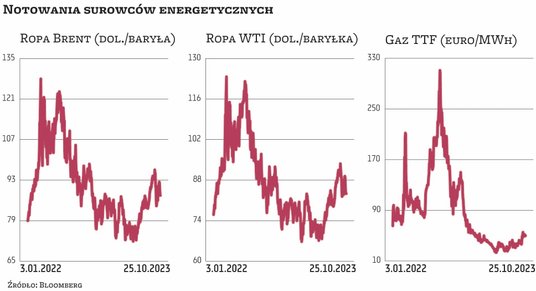 Jeszcze we wrześniu baryłka gatunku Brent wyceniana była na około 95 dol., jednak po silnych zwyżkach w ostatnich miesiącach doszło do wyraźnej przeceny i notowania znalazły się na poziomie 84 dol. na początku października. Wszystko zmieniło się po największym od lat ataku terrorystycznym na Izrael przeprowadzonym przez Hamas. Cena ropy wystrzeliła w górę i ponownie przekroczyła 90 dol. za baryłkę. Wzmożony popyt widoczny jest także na rynku gazu. Obecnie na holenderskiej giełdzie TTF kontrakty z dostawą za miesiąc wyceniane są na ok. 50 euro za MWh.