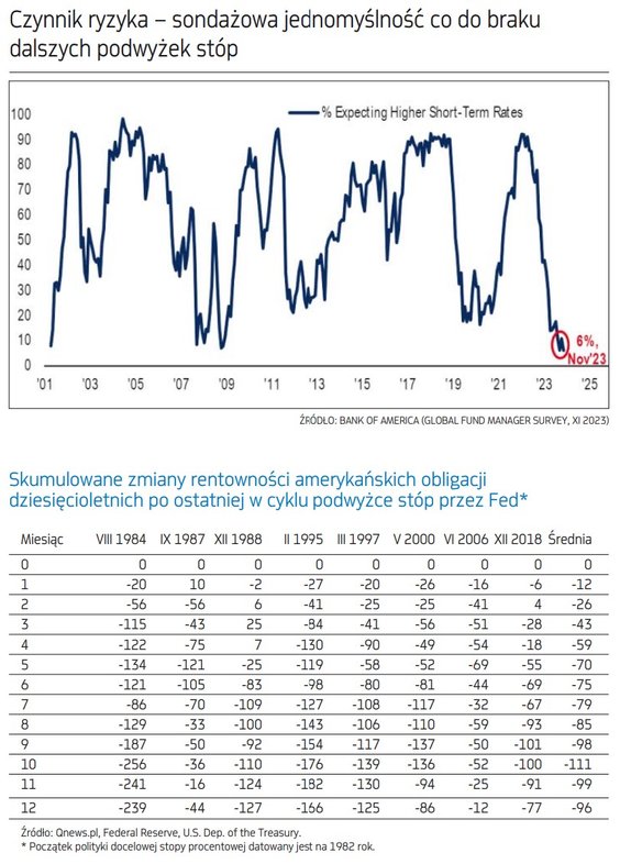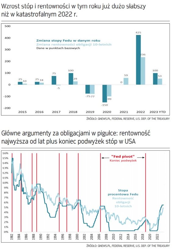 Zaskoczył nas natomiast rozwój wydarzeń na tzw. rynkach bazowych. „Fed pivot”, czyli koniec podwyżek stóp w USA, na przestrzeni roku konsekwentnie odsuwał się w czasie. Najpierw oczekiwano go w marcu, potem w maju, czerwcu, a tymczasem jeszcze w lipcu Fed, po raz ostatni jak na razie, podniósł koszt pieniądza. I wcale nie jest pewne, czy na tym już koniec, bo z wcześniejszych projekcji banku centralnego wynikała co najmniej jeszcze jedna podwyżka do końca tego roku. Przed nami jeszcze grudniowe posiedzenie Fedu (w 2018 r. właśnie w grudniu bank pod wodzą Jerome’a Powella pokusił się o ostatnią, powszechnie wtedy skrytykowaną, podwyżkę).
