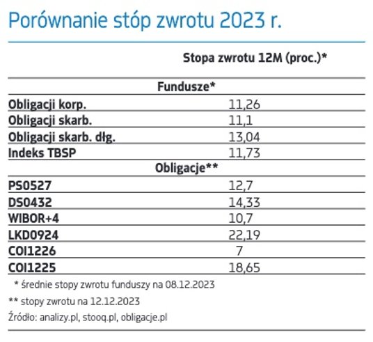 Załóżmy jednak, że inflacja faktycznie spadnie do 3,5 proc. i utrzyma się na tym poziomie. Wówczas stopa referencyjna „powinna” zostać obniżona o ok. 100 pkt, a rentowność obligacji powinna wynosić ok. 5,2 proc. – takie prawidłowości przynosi obserwacja historycznych zależności między wysokością inflacji, stóp procentowych i rentowności obligacji z lat, kiedy realne stopy procentowe były jeszcze dodatnie. Sęk w tym, że już obecnie rentowność dziesięcioletnich obligacji wynosi 5,3 proc., więc potencjału do wzrostu cen zbyt dużego już nie ma, a pamiętajmy, że aktualne wyniki fundusze dłużne zawdzięczają spadkowi rentowności o ok. 1,1 pkt proc. w 12 miesięcy.